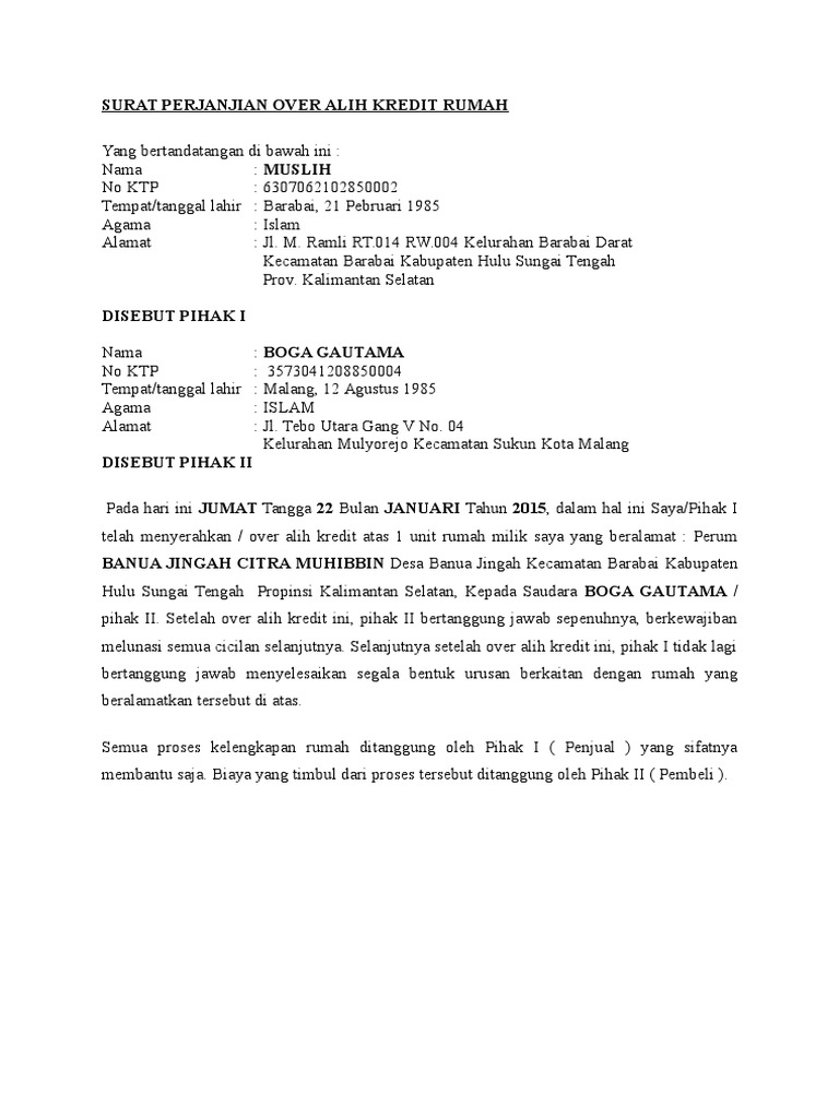 Apabila waktu yang telah ditentukan oleh bank btn yaitu 3 tahun rumah boleh diover kredit maka kedua belah pihak akan membawa perjanjian ini ke notaris untuk membuat akta jual belidemikianlah surat pernyataan over alih kredit rumah ini kami buat atas dasar musyawarahdan mufakat bersama dalam keadaan sehat jasmani dan rohani dan tanpa adanya paksaandari pihak manapun juga. Dimassa kredit pihak ke ii tidak boleh mentake over kredit kembali kepada pihak ke iii tanpa sepengetahuan pihak ke i demikian surat perjanjian ini dibuat dengan sebenarnya dalam keadaan sehat walafiat. Di dalam contoh surat over kredit rumah melalui notarisdocx telah diposting dengan harapan bahwa kami dapat memberi anda inspirasi untuk membuat surat perjanjian dengan baik dan benar. Berbagi ke twitter berbagi ke facebook bagikan ke pinterest. Cara membuat surat perjanjian over kredit membuat surat perjanjian over kredit sama saja dengan membuat surat perjanjian pada umumnya. Bandung 7 oktober 1984 pekerjaan.