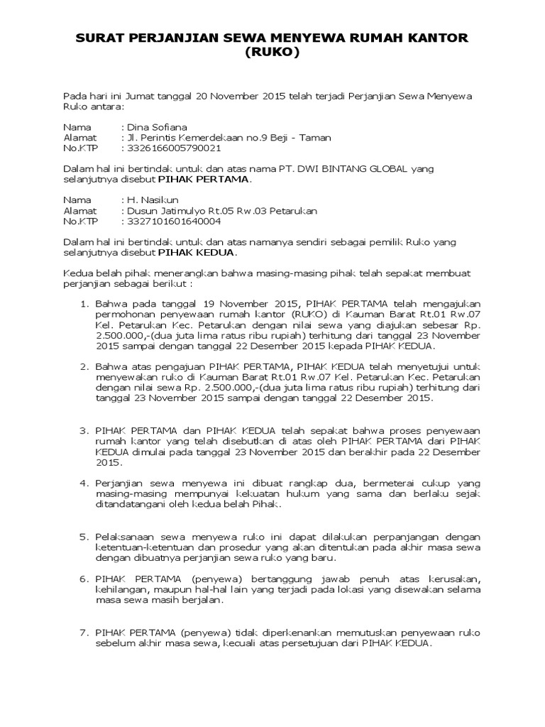 Contoh surat perjanjian sewa ruko. Dalam bisnis rumah toko surat perjanjian sewa ruko atau kios memang dibutuhkan untuk berpegang pada landasan hukum sehingga tidak terjadi pelanggaran diatara kedua belah pihak. Pihak pertama selaku pemilik sah bangunan ruko berikut pekarangannya di alamat lengkap ruko menjamin bahwa tanah dan bangunan ruko berikut semua fasilitas yang terdapat di dalamnya adalah hak milik sahnya dan bebas dari semua tuntutan hukum dan persoalan persoalan yang dapat mengganggu pihak kedua atas pemakaiannya dalam jangka waktu berlakunya surat perjanjian ini. 15 contoh surat perjanjian yang baik dan benar paling lengkap ketika dua orang atau dua pihak melakukan sebuah kesepakatan maka perlu adanya surat perjanjian yang jelas mengenai kesepakatan yang dibuat tersebut. Untuk sewa ruko saksi biasanya terdiri dari dua orang yaitu ketua rt setempat dan tetangga. 5 surat perjanjian sewa menyewa ruko lamudicoid pasal 12 perpanjangan masa kontrak pihak kedua mendapat prioritas pertama dari pihak pertama untuk memperpanjang masa penyewaan berikutnya sebelum pihak pertama menawarkan kepada calon calon penyewa lainnya. Contoh dibawah ini adalah sebagai satu referensi saja atau bila sudah sesuai dengan keinginan bisa anda gunakan saya yakin anda lebih paham akan hal ini.