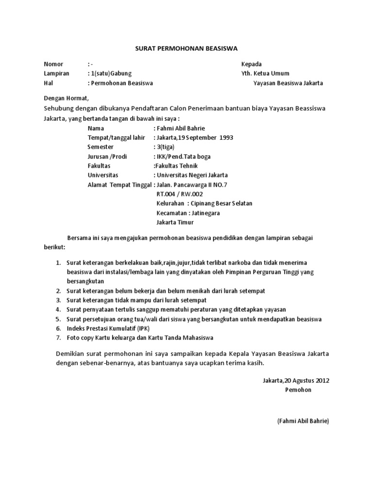 Apalagi saat ini semakin banyak beasiswa yang di siapkan oleh pihak sekolah untuk para siswanya. Contoh surat permohonan beasiswa. Itu tadi penjelasan singkat tentang contoh surat permohonan beasiswa yang dapat kami berikan pada kali ini. Contoh surat permohonan salah satu surat resmi yang sering dijumpai ketika seseorang ingin meminta bantuan orang lain adalah surat permohonan. Demikian surat permohonan ini saya ajukan untuk dapat diterima. Biasanya surat ini dibuat oleh mahasiswa yang memenuhi syarat seperti kurang mampu atau yang sangat berprestasi.