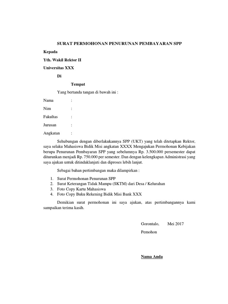 Melalui surat ini kami mengajukan permuhonan keringanan spp dengan alasan karena. Contoh surat permohonan keringanan biaya kuliah sebagai referensi dalam membuat surat permohonan keringanan biaya yang baik. Contoh surat permohonan keringanan biaya kuliah dari orang tua contoh 1. Contoh surat dispensasi kuliah untuk memohon penundaan pembayaran spp. Permohonan keringanan biaya kuliah dan penundaan pembayaran ukt lampiran. Admin blog berbagi contoh surat 2019 juga mengumpulkan gambar gambar lainnya terkait contoh surat permohonan keringanan biaya spp dibawah ini.