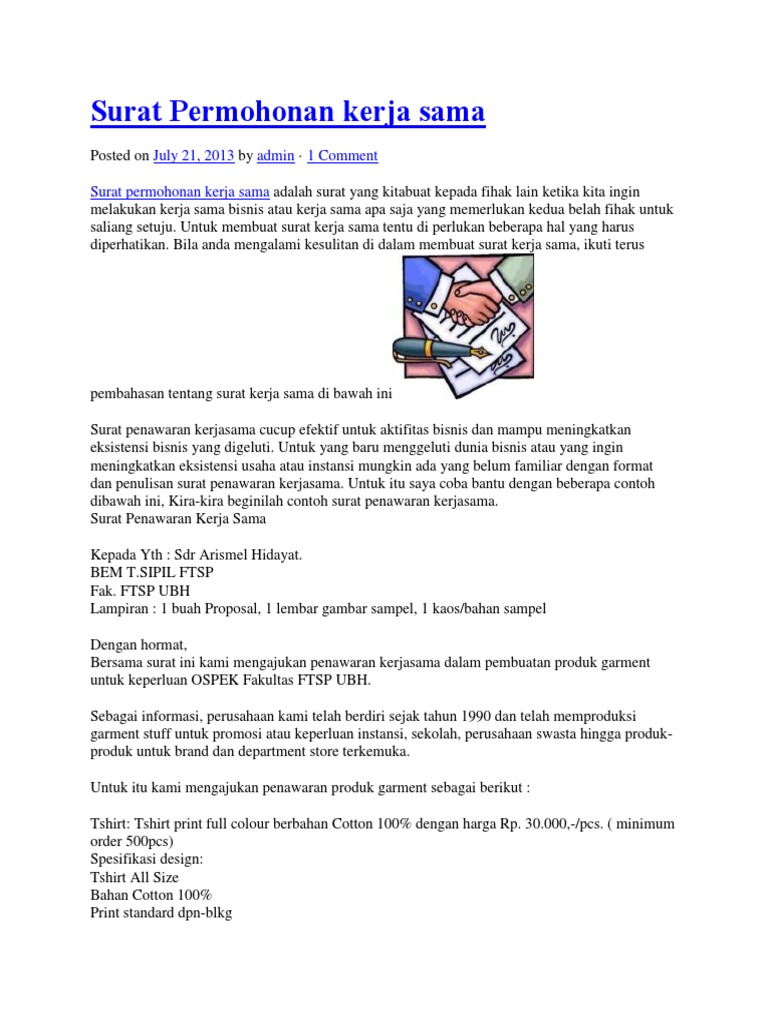 Surat permohonan kerjasama format dan contoh surat kerjasama kegiatan produk surat permohonan kerjasama merupakan sebuah surat resmi yang dibuat untuk menawarkan sebuah permintaan atau permohonan kerjasama kepada seseorang atau perusahaan agar mereka mau menerima tawaran yang kita berikan. 15 contoh surat permohonan kerjasama di berbagai bidang sebagai suatu perusahaan yang ingin maju dan berkembang maka tentu harus menjalin kerjasama dengan perusahaan lain maupun berbagai pihak lain. Tidak penting skala dari perusahaan tersebut apakah perusahaan tersebut besar maupun berskala sedang surat penawaran kerjasama sangatlah sering digunakan oleh perusahaan yang bersangkutan.