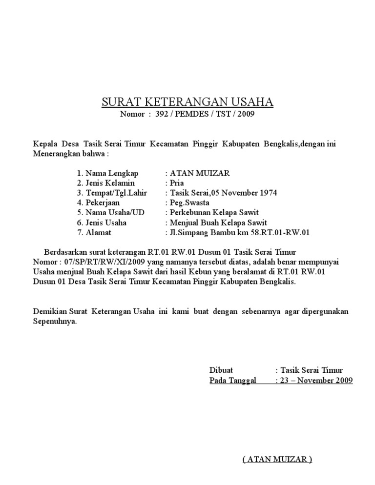 Contoh surat keterangan usaha biasanya sebuah surat keterangan usaha diperlukan dalam rangka memenuhi syarat kelengkapan untuk melakukan pengajuan kredit atau pinjaman ke bank. Surat permohonan pembuatan sku setelah kamu mempersiapkan syarat syarat diatas selanjutnya adalah melakukan beberapa tahapan sebagai berikut. Pada kesempatan kali ini kita masih akan membahas mengenai jenis surat keterangan. Kemungkinan jenis surat permohonan yang akan kamu buat atau kamu urus berbeda tapi tidak usah bingung kamu cukup menyesuaikannya dengan contoh yang kami berikan di atas. Contoh surat keterangan usaha sku terlengkap contohsuratmu google has many special features to help you find exactly what youre looking for. Ctiey91 salam biasanya kementerian pelajaran.