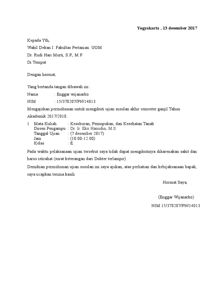 Kaprodi bapak abdul rahman saleh st msc. Kerana ketika ujianlah yang akan memilih nilai hasil mencar ilmu selama satu semester. Surat permohonan mengikuti ujian susulan jakarta 16 april 2012. Contoh surat permohonan ujian susulan kuliah. Surat permohonan ujian susulan.