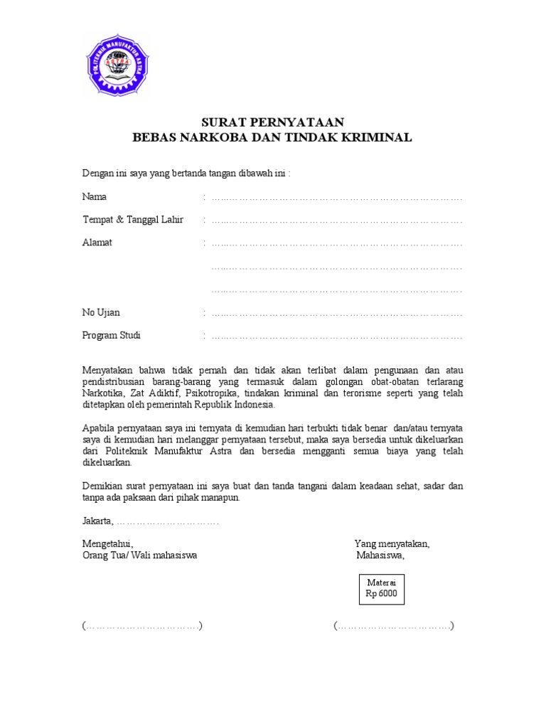 Contoh surat pernyataan bebas narkoba. A l a m a t. Bantul 14 agustus. Tidak perlu khawatir kini telah tersedia berbagai contoh surat pernyataanuntuk berbagai keperluan sehingga memudahkan anda untuk membuat surat pernyataan sesuai kebutuhan misalnya surat pernyataan belum menikah atau surat pernyataan bebas narkoba. Selain surat pernyataan kerja dan belum menikah biasanya yang paling sering diminta ketika melamar pekerjaan adalah surat pernyataan bebas narkoba dan obat terlarang. Pada contoh surat pernyataan bebas narkoba dibutuhkan oleh seseorang yang sedang melamar kerja ataupun untuk kebutuhan lainnya. Download surat bebas narkoba format pdf cpns 2018.