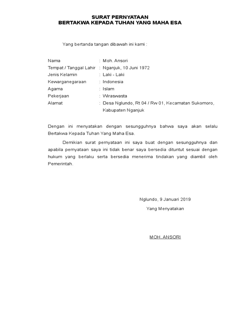 Contoh surat pernyataan bertaqwa kepada tuhan yang maha esa. Semoga contoh surat ini bermanfaat. Itulah contoh surat pernyataan bertaqwa kepada tuhan yang maha esa untuk calon perangkat desa. Contoh surat setia kepada pancasila uud 1945 dan negara kesatuan republik indonesia. Contoh format surat pernyataan bertaqwa kepada tuhan yang maha esa. Semua hal tersebut diatas silahkan cocokkan dengan biodata penduduk anda yang sesuai dengan e ktp atau kartu keluarga. Khususnya bagi anda yang membutuhkan surat pernyataan itu dalam konteks persyaratan pilkades maupun persyaratan administrasi di bidang lainnya.