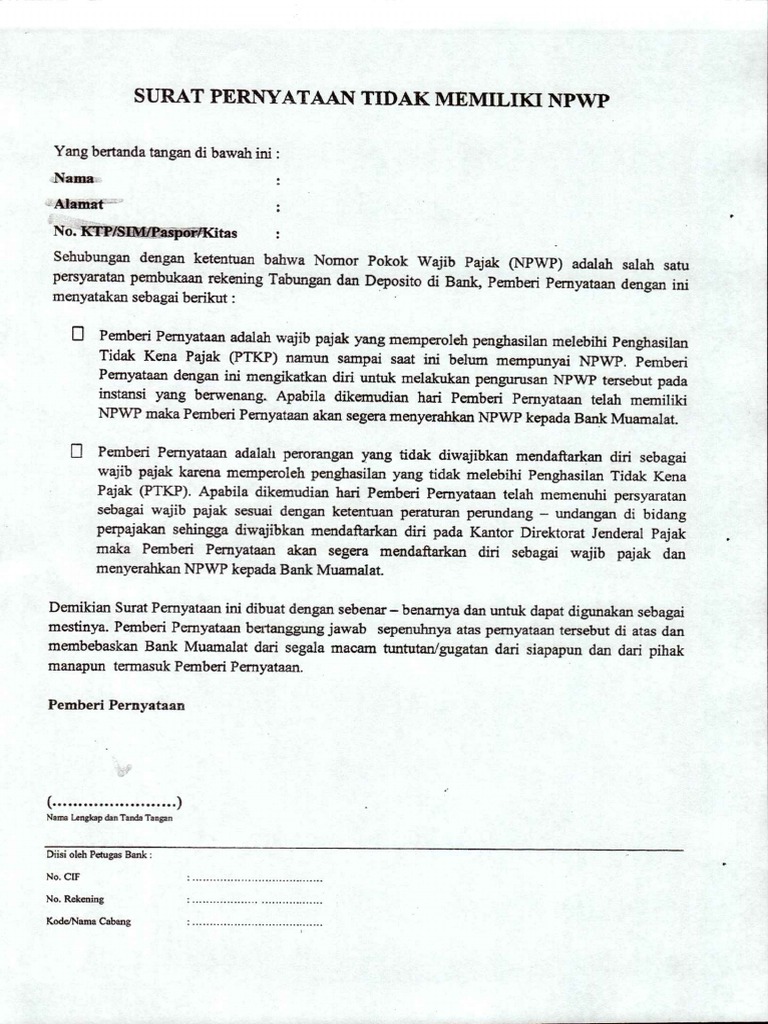 Jika tidak maka mestinya mengajukan surat keterangan sebagai pp 23. Anda juga bisa mencantumkan nama dan alamat disertai pernyataan bahwa yang anda bukan pengusaha kena pajak. Contoh surat pernyataan hutang piutang. Demikian contoh surat pernyataan npwp yang dibutuhkan untuk melengkapi syarat pembukaan nomor rekening di bank bri syariah dan salinan isi tulisannya.