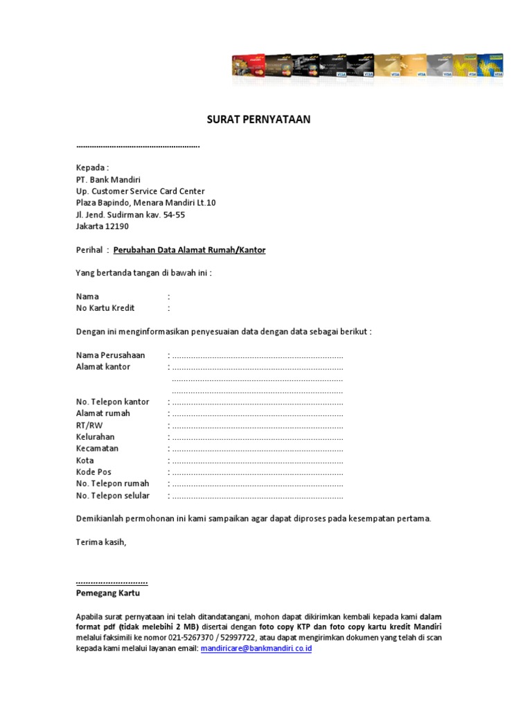 Contoh surat pernyataan perubahan data. Data diri dapat berkaitan dengan proses penagihan apabila terjadi tunggakan pembayaran hutang dari kartu kredit. Buku nikah ijazah akta kelahiran dan lain lain. Yang bersangkutan tanda tangan diatas materai. Untuk lebih jelas sebaiknya perhatikan contoh surat pernyataan dari beberapa fungsi. Apabila surat pernyataan ini telah ditandatangani mohon dapat dikirimkan kembali kepada kami dalam format pdf tidak melebihi 2 mb disertai dengan foto copy ktp dan foto copy kartu kredit mandiri melalui faksimili ke nomor 021 5267370 52997722 atau dapat mengirimkan dokumen yang telah di scan. Contoh surat pernyataan perubahan data kartu kredit bni artikel kali ini akan membahas mengenai surat pernyataan perubahan data yang dibuat untuk mengajukan permohonan perubahan data kartu kredit bni.