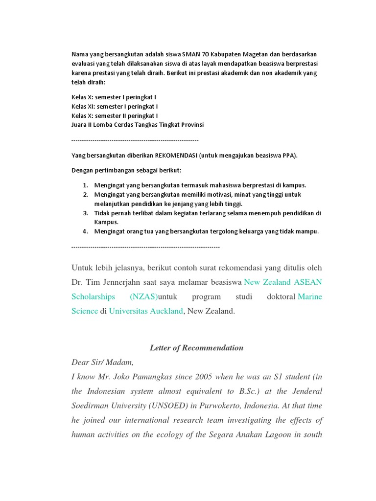 Namun pada umumnya untuk beasiswa luar negeri dibutuhkan surat rekomendasi dari guru konselor dan orang penting lainnya dalam kehidupan sang calon penerima beasiswa yang bisa memberikan bukti mengenai pencapaian pelajar tersebut. 2 contoh surat rekomendasi dalam bahasa inggris surat rekomendasi biasanya dikeluarkan oleh orang orang penting di suatu perusahaan universitas sekolah dllsurat ini dibuat untuk merekomendasikan seseorang yang dianggap pantas untuk mendapat posisi tertentu di perusahaan universitas atau sekolah tersebut. Saya ada contoh surat recomendasi dalam bahasa inggris. Namun bagi anda para pelajar baik siswa maupun mahasiswa bisa saja mendapat tugas dari sekolahkampus untuk menulis surat rekomendasi beasiswa dalam bahasa inggris.