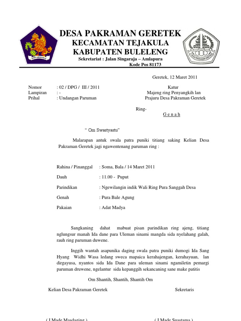 Contoh surat resmi bahasa bali. Kata kata indah. Hormon pada tumbuhan tanaman. Surat punika wantah surat atur piuningpakeling utawi contoh surat pemberitahuan sane kasurat olih pengremba pawangunan utawi panitia pembangunan ring desa pakraman. Contoh pidato bahasa bali. Pamicutetne dumogi contoh punika dados kaanggen ngalimbakang malih contoh contoh surat bahasa bali sane lianan. Mohon maaf apabila banyak kesalahan dalam penulisan artikel atau informasi tersebut yang ada kaitannya dengan contoh.