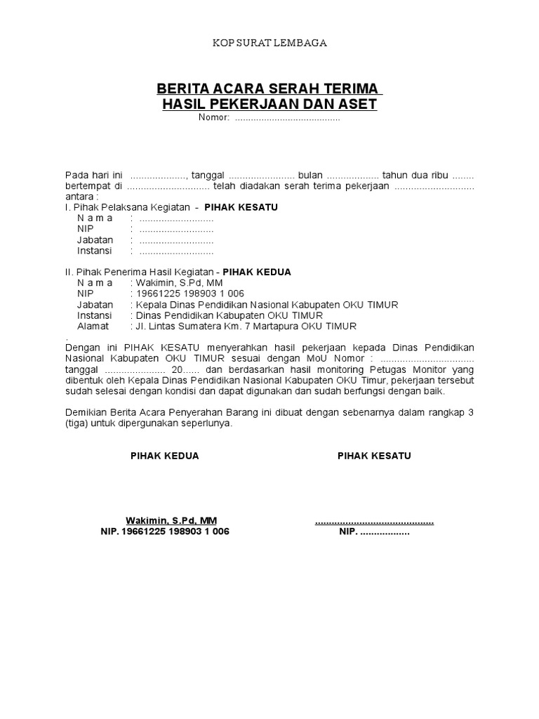 Contoh surat berita acara pekerjaan surat berita acara pekerjaan atau sering dikenal dengan surat berita acara serah terima barang atau surat berita acara selesai pekerjaan adalah surat yang dibuat setelah kita menyelesaikan pekerjaan kemudian surat tersebut ditandatangani oleh kedua belah pihak yaitu kita dan perwakilan dari instansi yang memberi pekerjaan kepada kita. Demikian berita acara serah terima pekerjaan ini dibuat dalam rangkap 5 lima untuk dipergunakan sebagaimana mestinya. Intinya berita acara adalah semacam surat yang mencatat dokumentasi sebuah kegiatan di dalam perusahaan untuk disimpan di dalam arsip perusahaan dan daapt digunakan lagi di waktu mendatang. Sumiadji msa ak nip. Diisi sesuai penelitian masing masing. Artikel contoh surat serah terima pekerjaan.