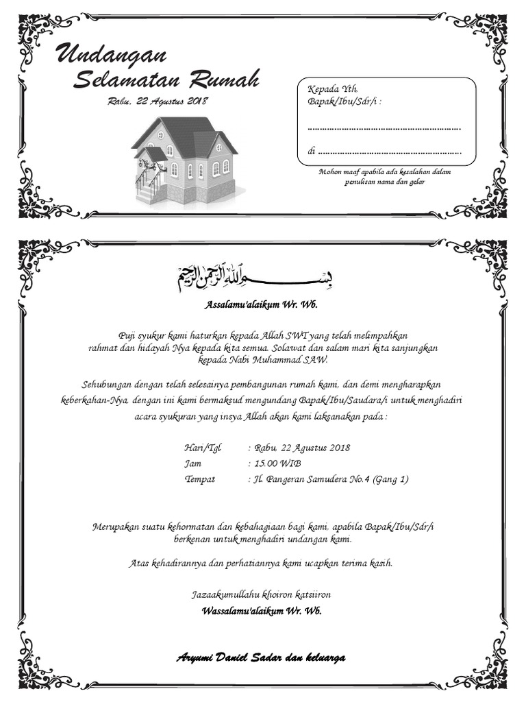 Contoh surat undangan syukuran. Adapun budaya tahlilan yang ada di jawa bukanlah hal wajib untuk di laksanakan oleh umat muslim mengingat rasullallah saw tidak pernah bersabda bahwa setelah. Atau bisa saja dengan alasan lain seperti pembelian rumah barurumah usaha baru dll. Contoh surat undangan syukuran kalau kita membuat udangan syukuran anak kita maka anda harus melakukan dengan cara ini dimana kamu bisa mengetahui tentang bagimana untuk membuat contoh undangan syukuran yang benar dan sesuai dengan undangan yang lainya. Mudah sekali kok membuat udangan syukuran hanya formatnya saja yang beda untuk itulah admin blog contoh surat dan proposal akan memberikan. Meski sudah sudah teknologi yang super canggih surat tetap diperlukan untuk berbagai kepentingan. Keduanya memiliki karakteristik yang berbeda dan digunakan untuk keperluan yang tidak sama.