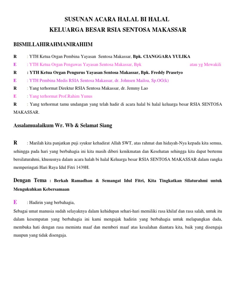 Contoh susunan acara halal bi halal. Contoh teks mc acara halal bihalal. Ini script yang aku pake ketika halal bi halal di kantor aku dadakan sih bikinnya karena dadakan juga jadi mc nya. Apakah saat ini kalian sedang mencari contoh dan teks pidato mc pada acara halal bihalal. Bismillahirrohmanirrohim assalamualaikum wrwb a lhamdulillahirobil alamin wabihi nastanginu ala umuridunya wadin wassalamuala sayidina muhammadin waala alihi wasohbihi wabarik wasalim ajmain amabadu. Aku mau berbagi script nya buat temen temen semua nih siapa tau bisa jadi masukan.