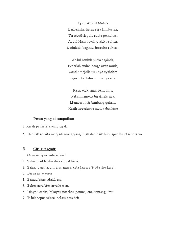 Contoh syair syair merupakan salah satu jenis puisi lama yang masih melegenda sampai sekarang kaya syair berasal dari bahasa arab syuur yang artinya perasaan kemudian semakin berkembang menjadi syiru yang artinya puisioleh sebab itu syair disini masih terikat dengan aturan penulisan sajak dan bait. Ada juga puisi di mana sebuah bait memiliki lebih dari 4 baris. Pada bait 1 penulis memberikan semangat untuk belajar dan tidak bersikap culas. Contoh gurindam 3 bait. Contoh syair tentang pendidikan seperti namanya syair ini berisi pendidikan dan pentingnya menuntut ilmu. Bait 2 juga isinya hampir sama dengan bait 1.