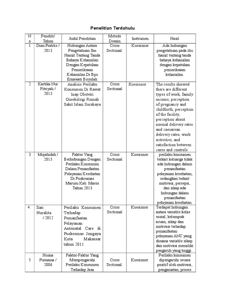 Contoh tabel penelitian terdahulu. Perbedaan dan kontribusi penelitian terdahulu nama peneliti dora yonica universitas lampung 2011 judul penelitian analisis perilaku imitasi anak setelah menonton film naruto. Homepage contoh contoh penulisan tabel penelitian terdahulu. Penelitian ini bertujuan untuk mengetahui apakah sumber dan pengelolaan modal kerja dikelola secara efektif pada pt. Mengangkat beberapa penelitian sebagai referensi dalam memperkaya bahan kajian pada penelitian penulis. Tabel 21 penelitian terdahulu no penelitian judul penelitian hasil penelitian perbedaan persamaan 1 arsono laksmana dan muslichah volume 4 nomor 2 tahun nopember 2002 pengaruh teknologi informasi saling ketergantungan karakteristik sistem akuntansi manajemen terhadap kinerja manajerial karakteristik sistem akuntansi manajemen. 21 penelitian terdahulu tabel 21 penelitian terdahulu no peneliti judul metode variabel hasil 1 ririn nafisah 2002 analisis faktor faktor bauran pemasaran yang mempengaruhi kecenderungan konsumen dalam memilih jasa angkutan malam validitas instrument reliabilitas analisis regresi linier berganda dan korelasi berganda uji f.