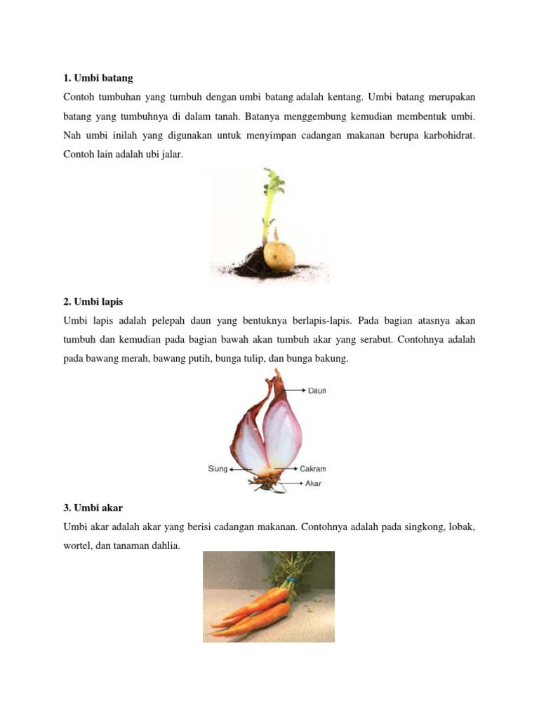 Tunas tersebut merupakan tumbuhan baru. Contoh tanaman umbi batang dalam bidang pertanian antara lain adalah sebagai berikut. Ternyata tanaman wortel ini tidak dapat berkembang biak dengan akarnya akan tetapi bila kita mengambil bagian batang yang berada pada pangkal akar lalu menanamnya maka tanaman wortel tersebut akan tumbuh dan berkembang biak serta akan membentuk batang namun batang. Umbi akar bahasa latin. Umbi akar ialah akar yang tumbuh membesar karena berisi cadangan makanan. Daftar isi artikel1 1umbi lapis 2 2.