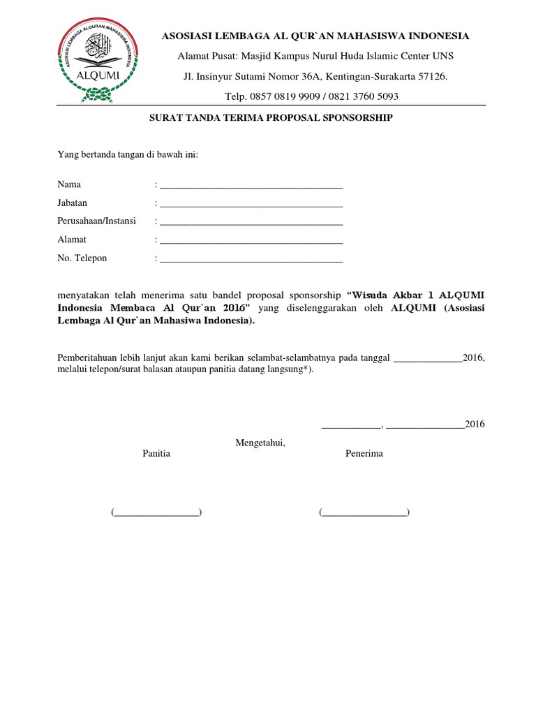 Bentuk atau contoh tanda terima proposal pendaftaran lembaga pendidikan al quran yang menjadi bukti atas pengajuan proposal dari taman pendidikan al quran tpq taklimul quran lil aulad tqa rumah tahfidz al quran rtq ataupun pendidikan anak usia dini al quran paud q dalam rangka mendapatkan nomor statistik dan sk tanda daftar dari kepala kantor kementerian agama mengacu. Nah itu tadi penjelasan singkat mengenai contoh surat tanda terima. Contoh surat tanda terima proposal posted by revolusi pendidikan on 1718 under contoh surat telah diterima satu berkas proposal nama kegiatan oleh. 3 contoh surat berita acara serah terima barang gudang contoh surat download contoh surat tanda terima barang serba guna 15 contoh surat tanda terima uang barang dan. Makalahid apakah anda tahu seperti apa contoh surat tanda terima barang. Semoga dengan penjelasan tadi membuat anda lebih paham lagi tentang surat tanda terima.