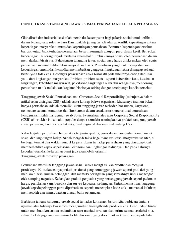 Contoh tanggung jawab sosial perusahaan. Contoh tanggung jawab sosial perusahaan. Contoh tanggung jawab sosial perusahaan terhadap pelanggan antara lain pengembangan komunitas community development. Yang menjadi pusat perhatian pimpinan adalah segala kegiatan perusahaan dari program pelaksanaan yang dilakukan sampai kebijaksanaan jangka panjang maupun jangka pendek terhadap lingkungan sekitar. Contoh tanggung jawab sosial perusahaan yang sudah sering di lakukan adalah mengelola limbah b3 secara baik. Me tanggung jawab sosial perusahaan atau corporate social responsibility selanjutnya dalam artikel akan disingkat csr adalah suatu konsep bahwa organisasi khususnya namun bukan hanya perusahaan adalah memiliki suatu tanggung jawab terhadap konsumen karyawan pemegang saham komunitas dan lingkungan dalam segala aspek operasional perusahaan. Pelaksanaan tanggung jawab sosial perusahaan corporate social responsibilitycsr memiliki tujuan utama untuk memastikan bahwa kepentingan sosial dari berbagai kelompok pemangku kepentingan pertamina dapat dipenuhi secara tepat dan proporsional terutama masyarakat yang berada di sekitar lingkungan kerja perseroan.