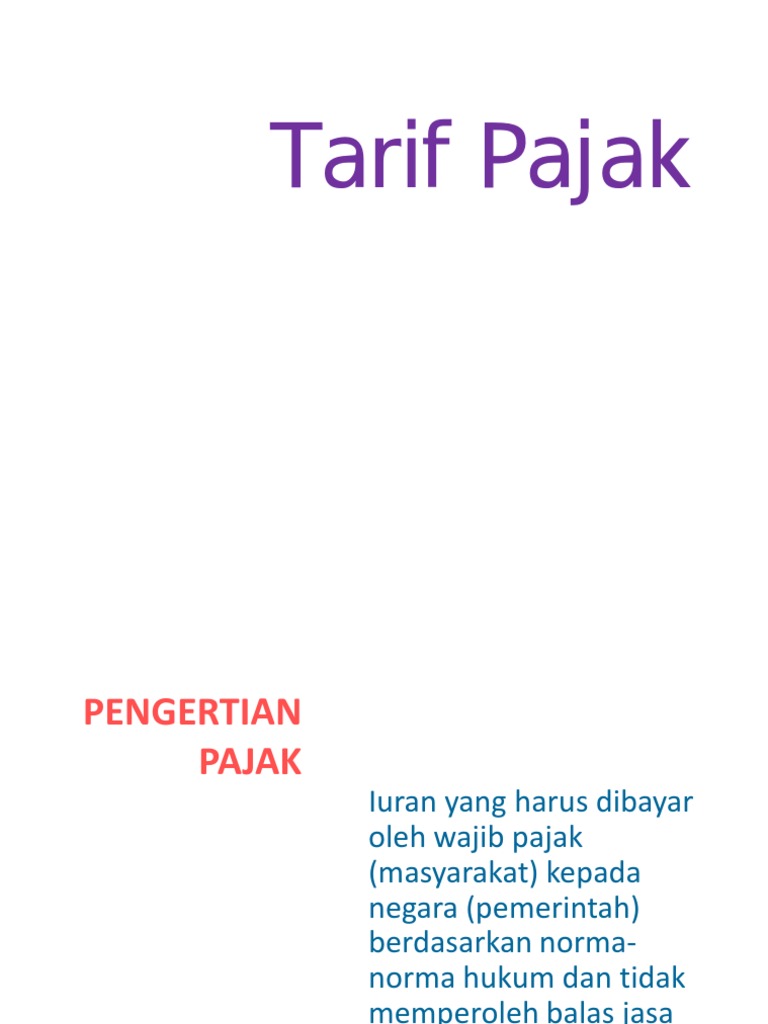 Pengertian tarif sering kali diartikan sebagai daftar harga sewa ongkos dan sebagainya sehingga dari pengertian tersebut sanggup disimpulkan bahwa tarif sama dengan harga. T arif pajak degresif tarif pajak degresif adalah persentase tarif pemungutan pajak yang menggunakan persentase yang semakin menurun apabila jumlah yang menjadi dasar. Tarif pajak regresif atau pajak degresif tarif pajak regresif atau pajak degresif adalah tarfi pajak yang dimana persentasinya akan semakin kecil atau berkurang ketika jumlah objek yang akan dipajakan semakin besar atau pkp penghasilan kena pajak. Artinya tarif pajak ini merupakan tarif pajak yang persentasenya akan lebih kecil dari jumlah yang dijadikan dasar pengenaan pajak tinggi. Salah satu contoh dari empat jenis tarif pajak diatas yang pernah ramai dibahas adalah salah satu nya tentang tarif pajak progresif karena beberapa waktutahun yang lalu pemerintah indonesia telah mengesahkan aturan yang dimana menjadikan orang yang memiliki kendaraan bermotor lebih dari dua maka akan dikenakan tarif pajak progresif misalnya si abdul mempunyai 2 jenis motor yang pertama.