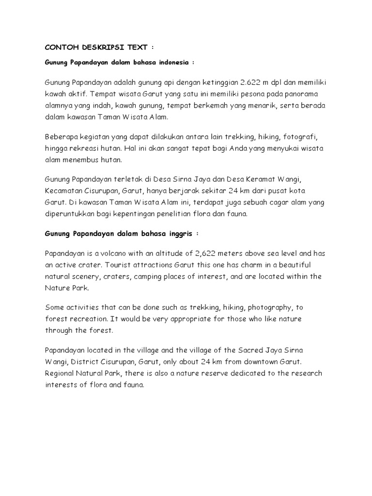 Contoh teks deskripsi terdapat berbagai jenis teks yang sering kita jumpai seperti narasi prosedur eksposisi laporan dan deskripsi. Contoh descriptive text tentang tempat wisata tourism place dalam bahasa inggris dan artinya.