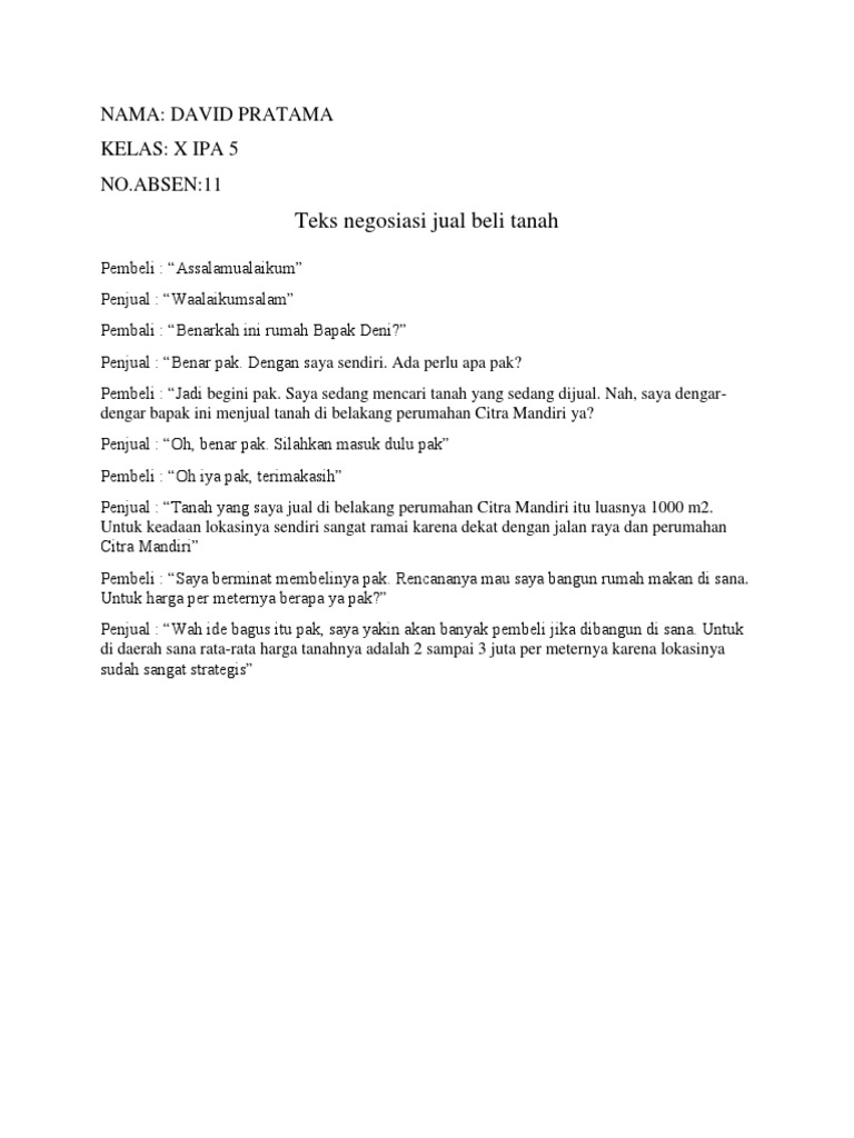 Teks negosiasi adalah salah satu jenis teks dalam bahasa indonesia yang umum kita jumpai didalam kehidupan sehari hari bentuk dan contoh teks negosiasi dapat bermacam macam antara lain adalah proses jual beli dan tawar menawar yang umumnya memuat sebuah dialog negosiasi guna menemukan kesepakatan bersama antar kedua belah pihak. Contoh teks negosiasi dalam bentuk narasi jual beli di sekolah pemecahan konflik larangan formal untuk 2 orang 3 orang 4 orang 5 orang.