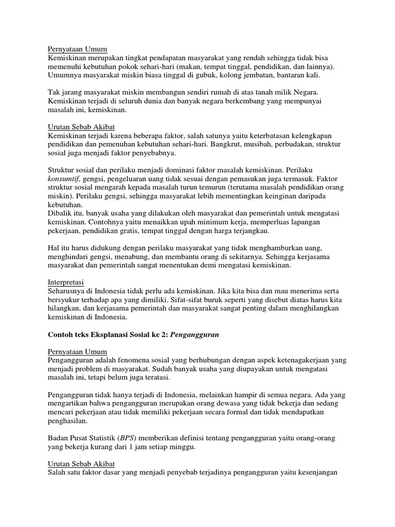 Contoh teks eksplanasi sosial kemiskinan. Dalam penulisan teks eksplanasi terdapat urutan struktur struktur pada pembentukannya yaitu sebagai berikut ini. Dengan pendapatan yang rendah masyarakat tidak mempu untuk mencukupi kebutuhan pokok seperti makan minum pakaian tempat berlindung dan pendidikan. Contoh teks eksplanasi sosial salah satu tujuan teks eksplanasi yaitu menjelaskan mengapa fenomena bisa terjadi dan sebab akibat peristiwa tersebut. Contoh teks eksplanasi tentang sosial kemiskinan kemiskinan adalah tingkat masyarakat dengan pendapatan yang rendah. Kemiskinan adalah tingkat masyarakat dengan pendapatan yang rendah. Berikut ini adalah beberapa contoh teks eksplanasisosial yang bisa anda gunakan sebagai referensi.