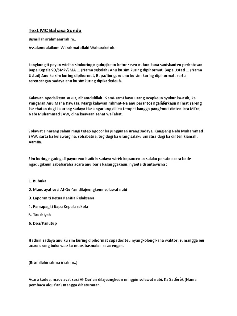 Contoh teks mc bahasa sunda. Contoh teks mc pernikahan dalam bahasa sunda assalamualaikum wr. Contoh teks pembawa acara mc bahasa sunda dalam sebuat acara sering kita melihat orang yang ditugaskan untuk mengatur acara yang biasa disebut dengan pembawa acara atau mc master of ceremony. Yang bertugas untuk mengatur jalannya acara mempersilahkan orang orang yang akan tampil di depan umum seperti memberikan sambutanmemberikan materi dan lain sebagainya. Sakumaha ka uninga ku urang sadayana alhamdulillah calon panganten pameget miwah rombongan parantos sumping ngaleut ngengkeuy ngabandaleut. Contoh teks mc singkat terbaik untuk berbagai acara pada kali ini rumus coid akan membahas mengenai contoh teks mc singkat tulisan terbaru. Contoh teks mc singkat terbaik untuk berbagai acara pada kali ini rumus coid akan membahas mengenai contoh teks mc singkat di dalam pembahasan ini kita akan menerangkan mulai dari pengertian ciri kesimpulan makalah struktur jenis dantujuan fungsi dan kaidah konsep lengkap dengan contoh nya.