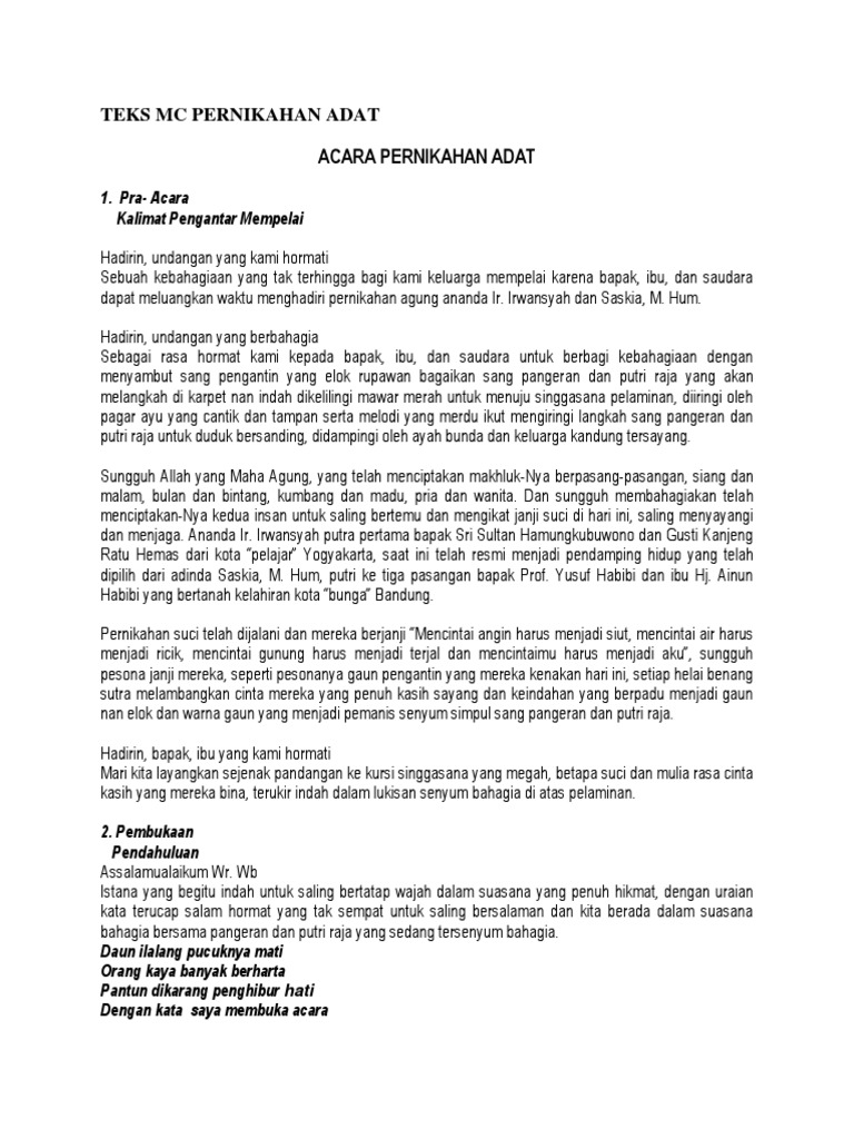 Contoh teks mc pernikahan. Ceramah singkat 5 tahun yang lalu usaha dan perjuanganku. Asslamualaikum wrw b. Demikianlah salah satu dan sedikitnya contoh susunan acara pernikahan yang pernah saya bawakan dan jika teman teman memiliki tambahan dan bisa sering diharapkan komentarnya. Teks mc pernikahan dan diantara tanda tanda kekuasaannya ialah dia menciptakan untukmu isteri isteri dari jenismu sendiri. Demikian contoh mcpembawa acara pernikahan walimatu ursy baca juga contoh yang kedua disini contoh mc pada acara perkawinan waliamtul ursy tweet. Kata kata motivasi 5 tahun yang lalu.