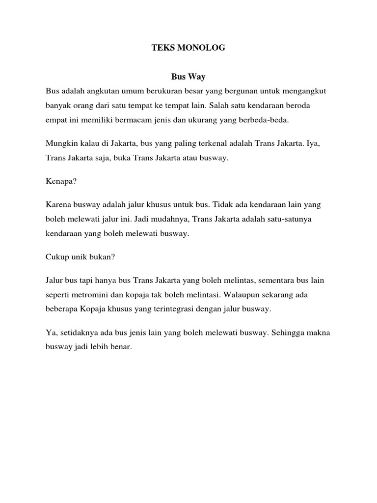 Leli adalah sosok remaja yang hidup dengan kadar ekonomi yang kurang baik. 25 juni 2015 2055 20486 0 2 mohon tunggu. Bus adalah angkutan umum berukuran besar yang bergunan untuk mengangkut banyak orang dari satu tempat ke tempat lain. Rincian jelas mengenai contoh teks monolog bahasa inggris dan artinya. Mulai dari ekspositoris dan sugestif. Berikut contoh teks monolog dengan tema transportasi.