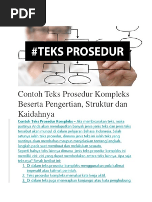 Contoh teks prosedur kompleks beserta struktur dan kaidahnya. Struktur pada teks prosedur kompleks dibagi menjadi tiga bagian yaitu bagian awal isi serta langkah pelaksanaan. Teks prosedur kompleks dapat diartikan sebagai karya tulis yang menunjukkan informasi mengenai langkah atau tahapan yang saling berhubungan untuk menyelesaikan. Contoh teks prosedur dalam menjalankan sesuatu tentunya membutuhkan beberapa langkah langkah yang disebut dengan prosedur. Bahasa indonesia tentunya memiliki berbagai contoh teks prosedur yang mudahnya bisa ditemukan di bungkus makanan instan. Teks prosedur memiliki 3 macam jenis diantaranya teks prosedur sederhana kompleks dan protocol. Bagian awal atau pertama biasanya ditulis dalam bentuk judul berisikan tujuan atau maksud dari tulisan selanjutnya berisi penjelasan tentang hasil akhir yang akan dicapai dari langkah langkah yang akan dijelaskan.