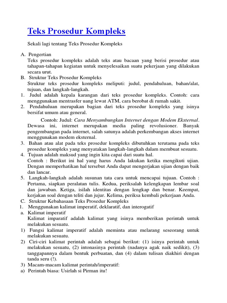 Contoh teks prosedur lengkap. Contoh teks prosedur dapat dipaparkan dengan lengkap yaitu sebuah teks yang menjelaskan rangkaian prosedural melakukan sesuatu hal dengan bentuk tahapan langkah langkah dan tindakan. Pengertian tujuan ciri struktur kaidah kebahasaan macam dan contoh teks prosedur. Teks prosedur kompleks dapat diartikan sebagai karya tulis yang menunjukkan informasi mengenai langkah atau tahapan yang saling berhubungan untuk menyelesaikan. Teks prosedur kompleks terdiri atas banyak langkah langkah dan berjenjang kepada sublangkah pada setiap langkahnya. Contohnya adalah prosedur tentang terkena tilang oleh polisi. Teks prosedur memiliki 3 macam jenis diantaranya teks prosedur sederhana kompleks dan protocol.