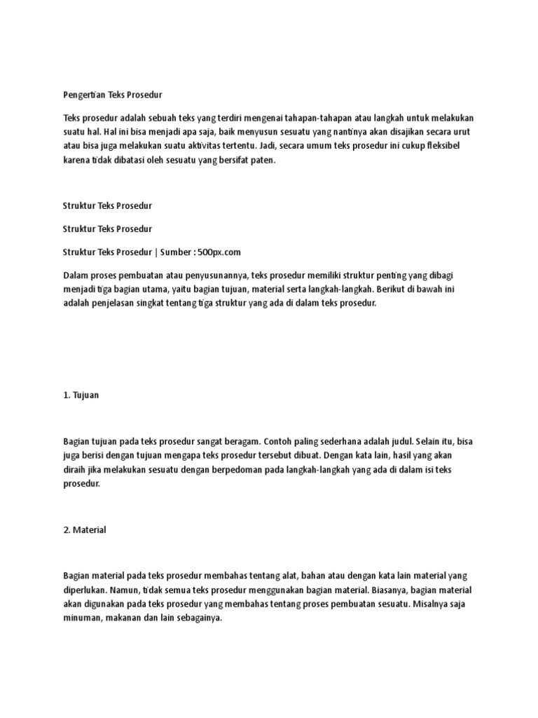 Contoh teks prosedur kompleks singkat sederhana protokol simple tentang membuat resep makanan minuman sesuatu kerajinan dll. Lengkap dengan pengertian dan struktur teks prosedur yang baik dan benar. Perhatikan saja contoh teks prosedur sederhana simpleks. Pengertian teks prosedur teks prosedur ialah teks yang berisi langkah tujuan untuk membuat atau mengerjakan suatu hal dengan cara demi cara yang pas secara berurutan hingga membuahkan satu tujuan yang diharapkan. Teks prosedur sederhana teks prosedur merupakan tulisan yang berisi langkah langkah untuk melakukan membuat atau mengoperasikan sesuatu. Dengan kata lain hasil yang akan diraih jika melakukan sesuatu dengan berpedoman pada langkah langkah yang ada di dalam isi teks prosedur.