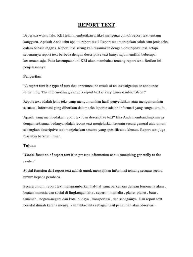 Contoh teks report bahasa inggris. Kumpulan contoh report text terbaru dalam bahasa inggris lengkap dengan terjemahan salam semangat selalu berbagi manfaat kali ini kita akan belajar contoh contoh dari report teks. Seperti kita ketahui bahwa teks report teks adalah dokumen tertulis untuk menjelaskan secara umum bagaimana sesuatu terlihat misalnya hewan fenomena alam sosial budaya dan banyak yang lain. Report text termasuk ke dalam descriptive text yang memiliki tujuan untuk memberikan informasi informasi kepada pembaca. Demam juga dikenal dengan istilah suhu bdana tinggi. Arti dari teks pendek bahasa inggris diatas bisa seperti berikut. Teks report hampir sama dengan teks descriptive dalam hal tujuannya purpose yaitu untuk memberikan deskripsi tentang suatu objek.