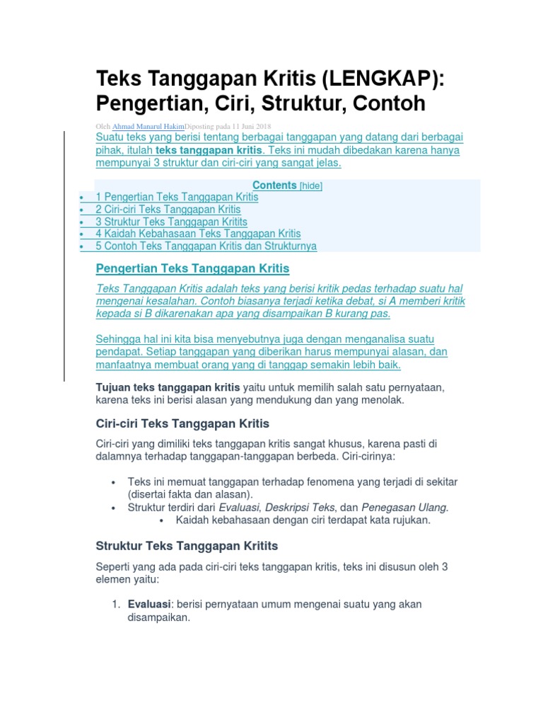 Contoh teks tanggapan kritis apa yang anda ketahui tentang teks tanggapan kritis. Teks tanggapan kritis mempunyai 3 struktur penyusun yang menjadi ciri cirinya. Contoh teks tanggapan kritis tentang pergaulan bebas. Tetap ada batasan batasan dimana kita dapat mengutarakan pendapat dengan baik. Seperti yang kita tahu bahwa teks tanggapan kritis berisi kritik pedas mengenai suatu hal tentang kesalahannya. Teks tanggapan kritis pengertian ciri struktur kaidah tujuan contoh untuk kali ini kami akan membahas mengenai teks tanggapan kritis yang dimana dalam hal ini meliputi pengertian ciri struktur kaidah tujuan dan contoh nah agar lebih untuk memahami dan dapat mengerti kalau begitu simak saja ulasan berikut ini.