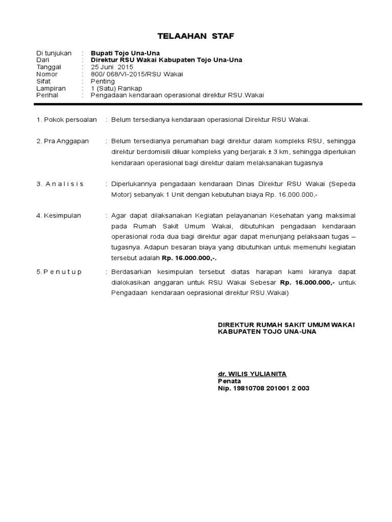 Simpan simpan format telaahan staf untuk nanti. Penulis menyadari bahwa laporan ini jauh dari sempurna dikarenakan oleh keterbatasan ilmu yang dimiliki oleh penuliskritik dan saran sangat di harapkan penulis demi kesempurnaan telaahan staf ini agar bermanfaat bagi penulis maupun perusahaanuntuk itu penulis mohon maaf atas segala kekeliruan yang mungkin terdapat dalam penulisan inisemoga penulisan telaahan staf ini dapat bermanfaat. 10 telp 0567 21092 kode pos. Ini juga yang kadang kadang disalahartikan oleh para staf ahli itu sendiri yang akhirnya bukan berperan sebagaimana yang diharapkan tetapi nyerempet nyerempet ke asisten. Harapan saya dapat memberikan manfaat wacana masukan ataupun konsep inovatif bila para blogger juga mengalami permasalahan yang sama. Berikut ini saya sertakan sebuah contoh singkat telaahan staf tentang perlunya dibuatkan aturan oleh pimpinan daerah tentang kebijakan mutasi tenaga kesehatan strategis.