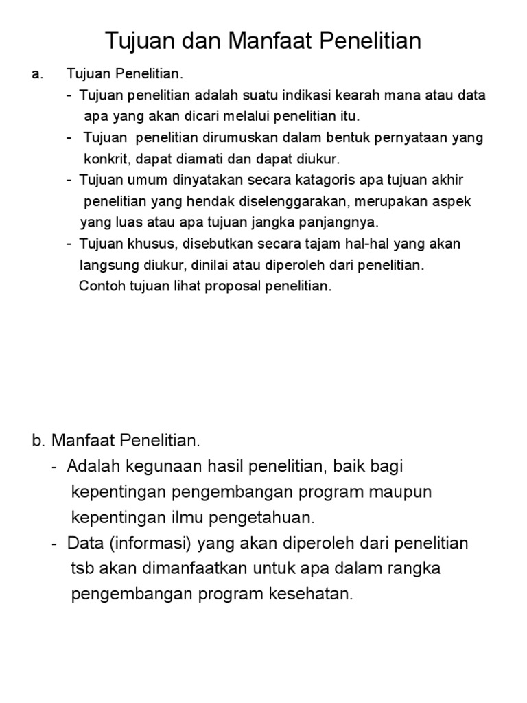 Secara umum manfaat penelitian dibagi menjadi dua bidang. Secara umum tujuan penelitian juga disebut sebagai tujuan penulisan yang dihasilkan dari proses tinjauan pustaka. Manfaat penelitian adalah manfaat atau potensi yang dapat dicapai oleh beberapa pihak setelah penyelesaian penelitian. Pengembangan bermakna bahwa untuk membangun dan memajukan pengetahuan yang telah ada. Contoh manfaat dan tujuan penelitian 1. Contoh manfaat dan tujuan penelitian manfaat penelitian 1.
