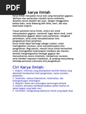 Karya ilmiah adalah sebuah tulisan yang berisi suatu permasalahan yang diungkapkan dengan metode ilmiah soeparno 199751. Data kesimpulan dan informasi lainnya yang terkandung dalam karya ilmiah akan berfungsi sebagai.