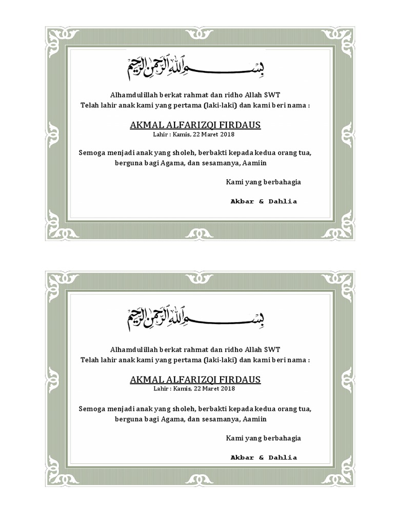 Pastinya semakin lengkap keluargamu. Unduh untuk dicetak secara fisik atau cukup klik bagikan untuk diunggah ke akun sosial media sahabat dan keluarga. Doa kami menyertai bayimu. Setelah anak lahir puncaknya ketika aqiqah anak di hari ketujuh sanak saudara dan tetangga berdatangan. Kami sekeluarga mengucapkan selamat atas kelahiran anak bapakibu yang ke semoga menjadi penerus dan keturunan yang terbaik. Tidak hanya sebatas turut berbahagia tetapi juga mampu membangun ukhuwah yang kuat.