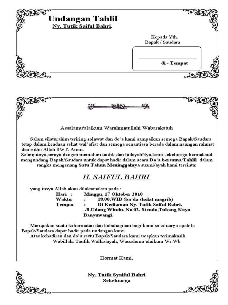 Kami berbagi contoh surat undangan tahlil 40 100 1000 hari haul digunakan untuk acara tahlilan. Mohon maaf apabila banyak kesalahan dalam penulisan artikel atau informasi tersebut yang ada kaitannya. Contoh surat undangan tahlil 40 100 1000 hari. Tahlilan adalah bentuk solidaritas di kalangan umat islam untuk memberikan dukungan kepada orang orang yang tertinggal. Adapun budaya tahlilan yang ada di jawa bukanlah hal wajib untuk di laksanakan oleh umat muslim mengingat rasullallah saw tidak pernah bersabda bahwa setelah. Tahlilan diadakan sebagai acara untuk memperingati hari kematian seseorang berdoa untuk seseorang dan juga refleksi bagi kita bahwa kita sangat dekat dengan nama kematian.