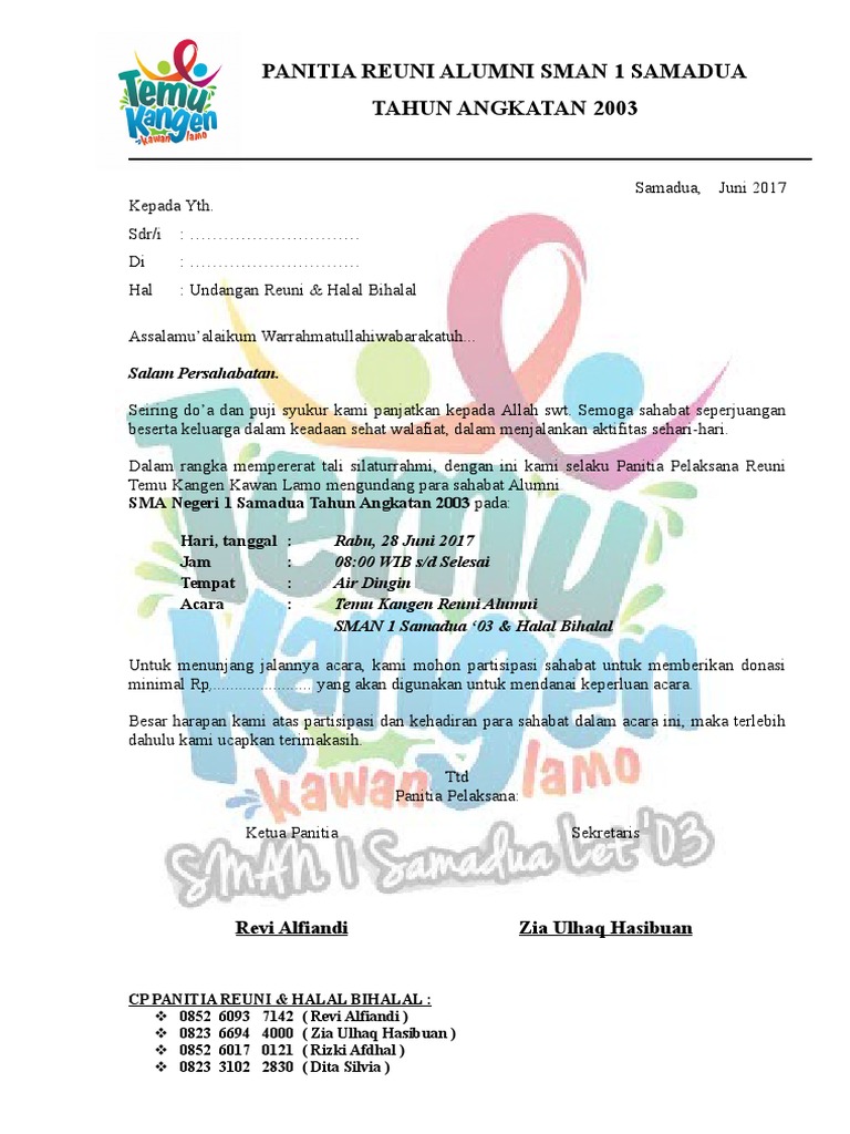 Contoh surat undangan formal reuni reuni adalah acara pertemuan yang diadakan untuk ber silaturahmi atau bertemu kembali setelah lulus dari sebuah sekolah atau akademi tertentu. Contoh undangan reuni sekolah dasar. Selain itu ada juga beberapa jenis reuni yang mungkin sering dilakukan seperti reuni rekan team olahraga reuni teman satu kantor teman satu. Acara atau event ini sangat ditunggu tunggu sekali bagi para sahabat kawan kawan alumni untuk ajang temu kangen dan cepaka cepiki hihi. Contoh surat undangan reuni reuni merupakan suatu kegiatan yang seringkali dilakukan dengan tujuan mempererat tali silaturahmi. Contoh undangan reuni smpsma.