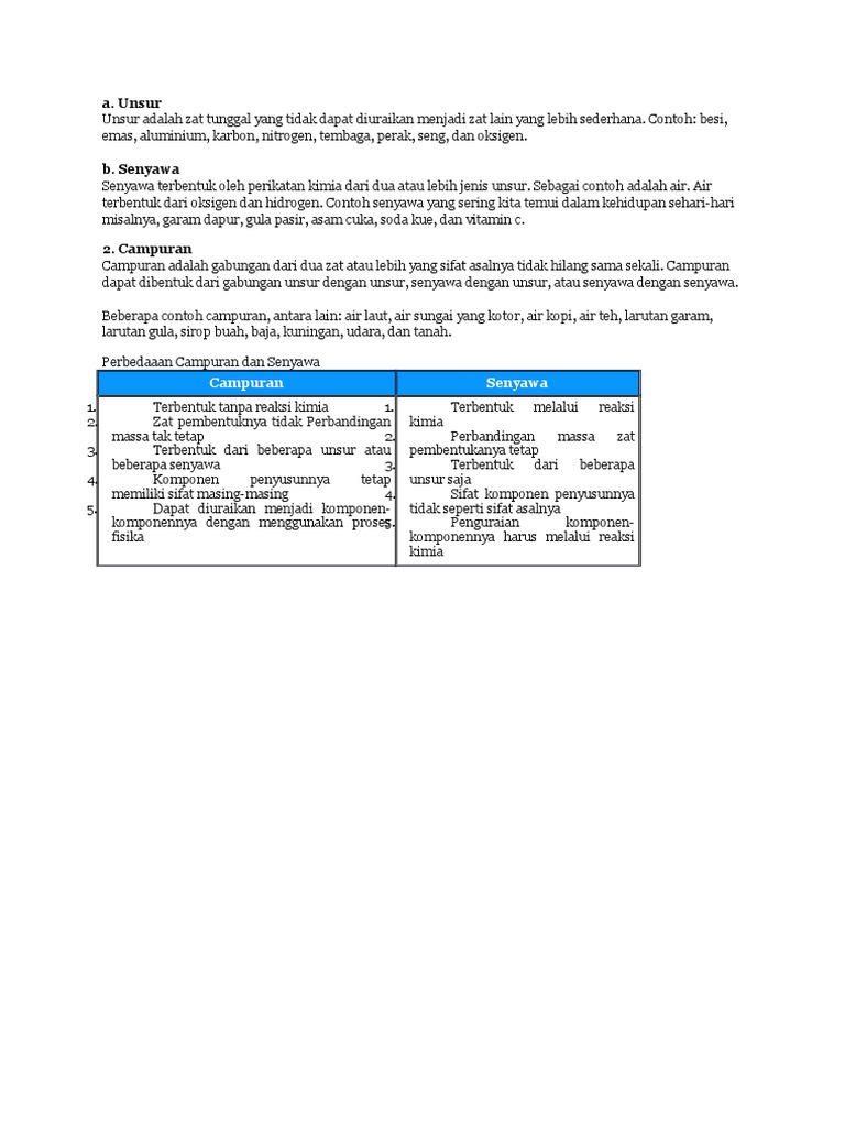 Mulai dari zat tunggal yang terdiri dari unsur dan senyawa sampai dengan campuran yang merupakan kumpulan berbagai macam zat. Senyawa tersusun dari dua unsur ataupun lebih lewat sebuah reaksi kimia. Unsur memiliki sifat yang kerap berubah secara penuh saat menjadi bagian dari sebuah senyawa. Beberapa contoh senyawa organik. Unsur senyawa dan campuran pengertian sifat jenis tata nama contoh untuk pembahasan kali ini kami akan mengulas mengenai unsur senyawa dan campuran yang dimana dalam hal ini meliputi pengertian sifat jenis tata nama dan contoh nah agar lebih dapat memahami dan mengerti simak ulasan selengkapnya dibawah ini. Contoh metalloid adalah germanium dan silikon.
