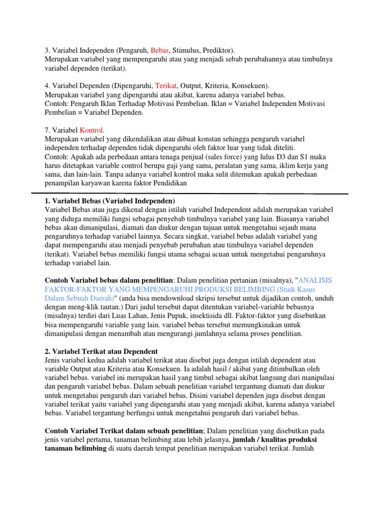 Contoh variabel bebas dan terikat dalam penelitian pendidikan. Variabel intervening adalah variabel yang secara teoritis mempengaruhi hubungan antara variabel bebas dengan variabel terikat tetapi tidak dapat diamati dan diukur. Variabel bebas dan terikat atau disebut juga variabel independen dan dependen adalah dua jenis variabel penelitian yang dapat digunakan peneliti untuk merumuskan hipotesis. Variabel dependen sedangkan untuk variabel dependen merupakan suaatu variabel yang tidak bebas terikat dan juga mempengaruhi tiap tiap variabel bebas atau juga variabel independen. Contohnya dalam penelitian tentang merokok dan kanker paru paru merokok yang memang telah dilakukan oleh banyak subyek merupakan variable bebas sementara kangker paru paru merupakan akibat dari merokok atau sebagai. Contoh variabel terikat dalam penelitian pendidikan antara lain adalah hasil belajar siswa kesiapan belajar siswa kemandirian belajar danatau skor tes. 38 menjelaskan bahwa variabel adalah segala sesuatu yang berbentuk apa saja yang ditetapkan oleh peneliti untuk dipelajari sehingga diperoleh informasi tentang hal tersebut.