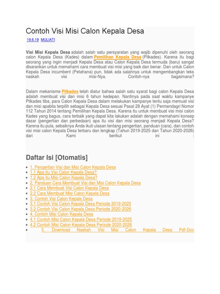 Contoh visi misi calon kepala desa kades lengkap bento. Berkat rahmat taufik dan. Sedesaid sahabat sedesa pada tahun 2019 sebagian besar masyarakat desa kembali akan memilih pemimpinnya untuk menjadi kepala desa lima tahun mendatang. Dalam pelaksanaannya beberapa daerah akan diadakan pada bulak oktober dan november 2019. Bogor infodesaku berbekal kepercayaan dari masyarakat yang cukup tinggi setelah sebelumnya menjadi kepala desa pada periode tahun 2012 2018 jani nurjaman kembali maju dalam pilkades desa kalongliud yang akan digelar pada 28 oktober mendatang. Sendang wonogiridesaid sendang wonogiridesaid empat hari menjelang hari pencoblosan panitia pemilihan kepala desa sendang menggelar tahapan penyampaian visi misi dan program kerja bagi calon kepala desa sendang sabtu 112.